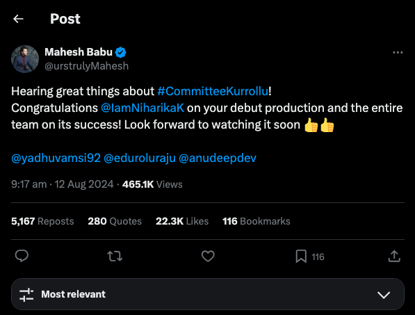 https://x.com/urstrulymahesh/status/1822842277363880403 “కమిటీ కుర్రోలు”: నిహారిక కొణిదెల తొలి ప్రొడక్షన్ బాక్సాఫీస్ వద్ద సంచలనం సృష్టించడంతో పాటు సూపర్ స్టార్ మహేష్ బాబు ప్రశంసలను పొందింది నిహారిక కొణిదెల తన తొలి ప్రొడక్షన్ అయిన “కమిటీ కుర్రోలు” తో తెలుగు సినిమా రంగంలో ఒక సాహసోపేతమైన మరియు విజయవంతమైన అడుగు… నిహారిక కొణిదెల “కమిటీ కుర్రోలు” పై మహేష్ బాబు ప్రశంసలు – తెలుగు సినిమా రంగంలో ఒక గేమ్-చేంజర్